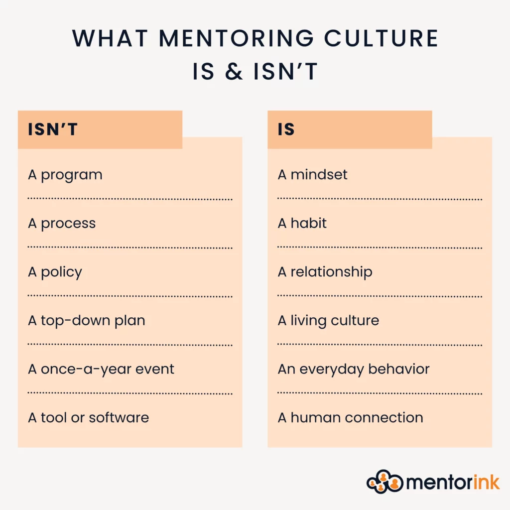 You might ask what a mentoring culture really means. Before answering that, let’s first look at what it isn’t. A mentorship culture isn’t a campaign or a project plan. It’s not about assigning pairs once a year or tracking participation in a spreadsheet. It’s about how people show up for each other, every day.