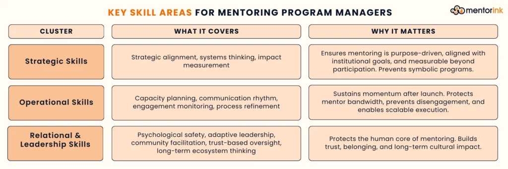 Below are the essential skill clusters that define high-performing mentoring program managers today.